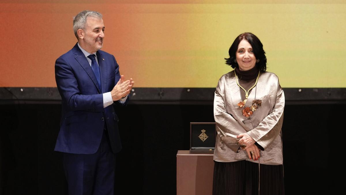 El alcalde de Barcelona, ​​Jaume Collboni, entrega la medalla de oro al mérito cultural a Marisol Schulz, directora de la FIL de Guadalajara / Ferrán Nadeu