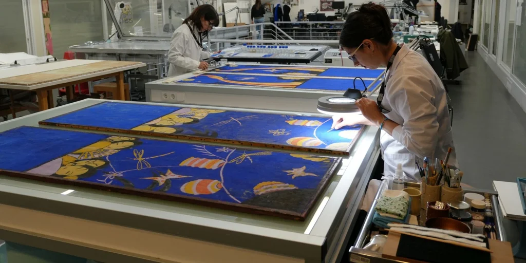 Acompañados por Jorge García Gómez-Tejedorjefe de Restauración del Reina Sofía, nos dirigimos al taller, donde las restauradoras Keti Nikolaeva y Eugenia Gimeno Están trabajando en el biombo de Dalí, que se encontró muy deteriorado. Los paneles exteriores están más dañados que los interiores. Sobre una mesa, los cuatro paños pintados por Dalí. El color predominante es el azul ultramarcuyas faltas hay que reintegrar. En otra mesa, las estructuras en las que va montado el biombo: «El interior es una estructura de madera cubierta por los dos lados de papel. En el reverso tiene una tela blanca y en el anverso tiene otra tela pegada con papeles y encima pintado», explican las restauradoras.