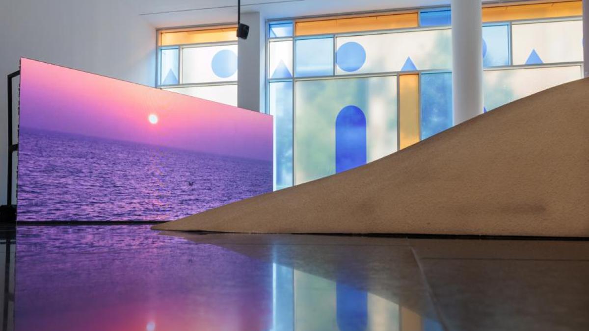 Moreno descubrió, por ejemplo, que Bofill no quiso imponer nada sino que se inspiró en la arquitectura vernácula del norte de África. “Llegó y dijo: ¿pero qué hacéis construyendo con cemento importado a la Unión Soviética que os están cobrando una pasta si están sobre barro? E incluso reactivó una fábrica abandonada de ladrillos”, relata Moreno, que al final, sobre la mesa de montaje, transformaron las imágenes documentales en una película de ficción cuyo personaje pronuncia una frase clave: “No estoy fotografiando ruinas”. Frente al filme, una duna ejerce de mirador desde el que observa las dunas del desierto y en los grandes ventanales que dan a la Capilla de la Misericordia, un vinilo réplica de los elementos arquitectónicos del edificio religioso.