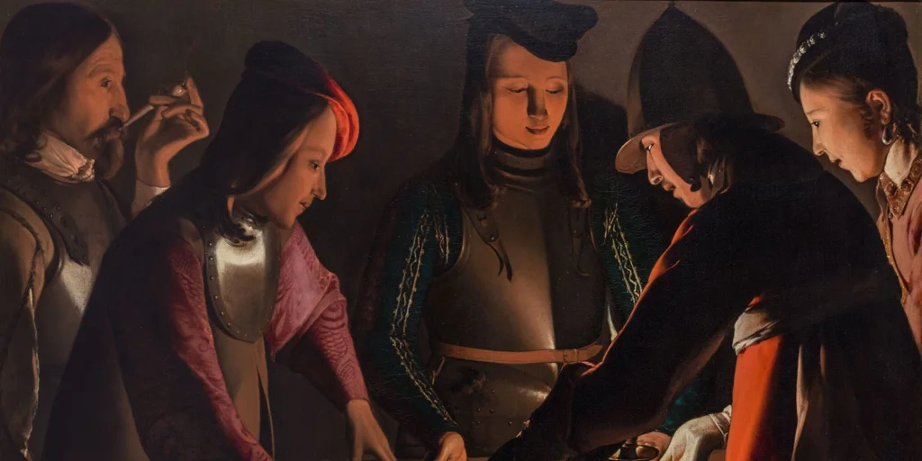 Este entorno favoreció una prestigiosa clientela entre la que destacaba el cardenal richelieupara quien pintó un ‘San Jerónimo penitente’, desnudo con un imponente capelo cardenalicio a su lado. La Tour produjo numerosas versiones de sus composiciones de éxito, para lo que necesitó rodearse de un importante taller en el que su hijo Étienne ocupó el puesto principal. ‘Los jugadores de dados’ (1640-1652) tiene una pequeña firma en el extremo izquierdo del tablero de la mesa, trazada con letras finas en blanco, es la única en su corpus. En el lienzo, los cuatro jóvenes agrupados alrededor de la mesa y el hombre fumando una pipa, no recibieron el mismo tratamiento. La delicadeza de los rasgos del jugador con una perla en la oreja, su cuello bordado y la cara en plena luz contrastan con la ejecución dura y seca de sus adversarios.