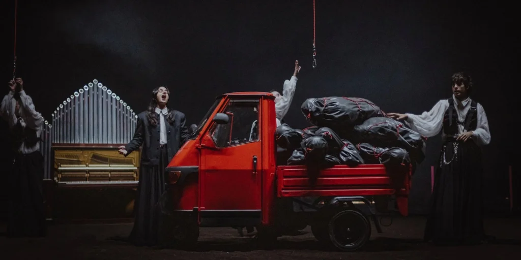 El texto -inconcluso- de la autora catalana, que ha sido calificado como «un cuento de hadas negro y macabro», y que mezcla en sus páginas cotidianeidad y horror, es la falsilla sobre la que Marcos Morau y La Veronal han creado este espectáculo, estrenado el verano pasado en la Bienal de Venecia. El creador (el término ‘coreógrafo’ se le queda corto) se sumerge en un universo al tiempo terrestre y místico, ritual y oscuro, radical, inquietante y perturbadoramente bello.