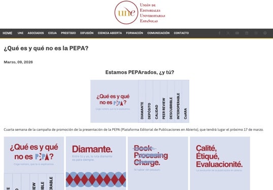 La Unión de Editoriales Universitarias Españolas ha presentado el 17 de marzo (en la sede de FECYT, Madrid) su Plataforma Editorial de Publicaciones en Abierto (PEPA), una infraestructura tecnológica interoperable según los estándares de la comunidad mundial, que reúne las monografías en acceso abierto de las 73 editoriales de universidades y centros de investigación que integran la asociación para garantizar la preservación, gestión y difusión del conocimiento. La presentación está disponible en el canal de YouTube de la UNE.