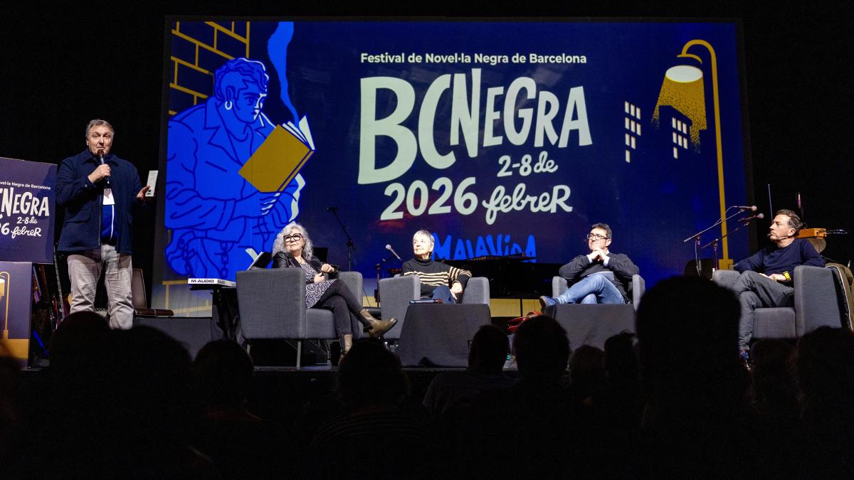 Carlos Zanón comenza BCNegra, en la Sala Paral·lel 62, con la “noticia extraordinaria que una editorial que publica en català autores d’aquí i clàssics arriba als 100 títulos, i ho fa recuperant la trilogia d’un autor emblemàtic”. Es refereix a la col·lecció Crims.cat de l’editorial Clandestina, que protagoniza el primer acto del certamen, Cent títols després, tornem a l’origen: Rafael Tasiscon el editor Ilya Pérdigo y los escriptores de novela la negra Margarida Aritzeta y Teresa Solana, moderadores por Àlex Martín Escribà, director de la col·lecció.
