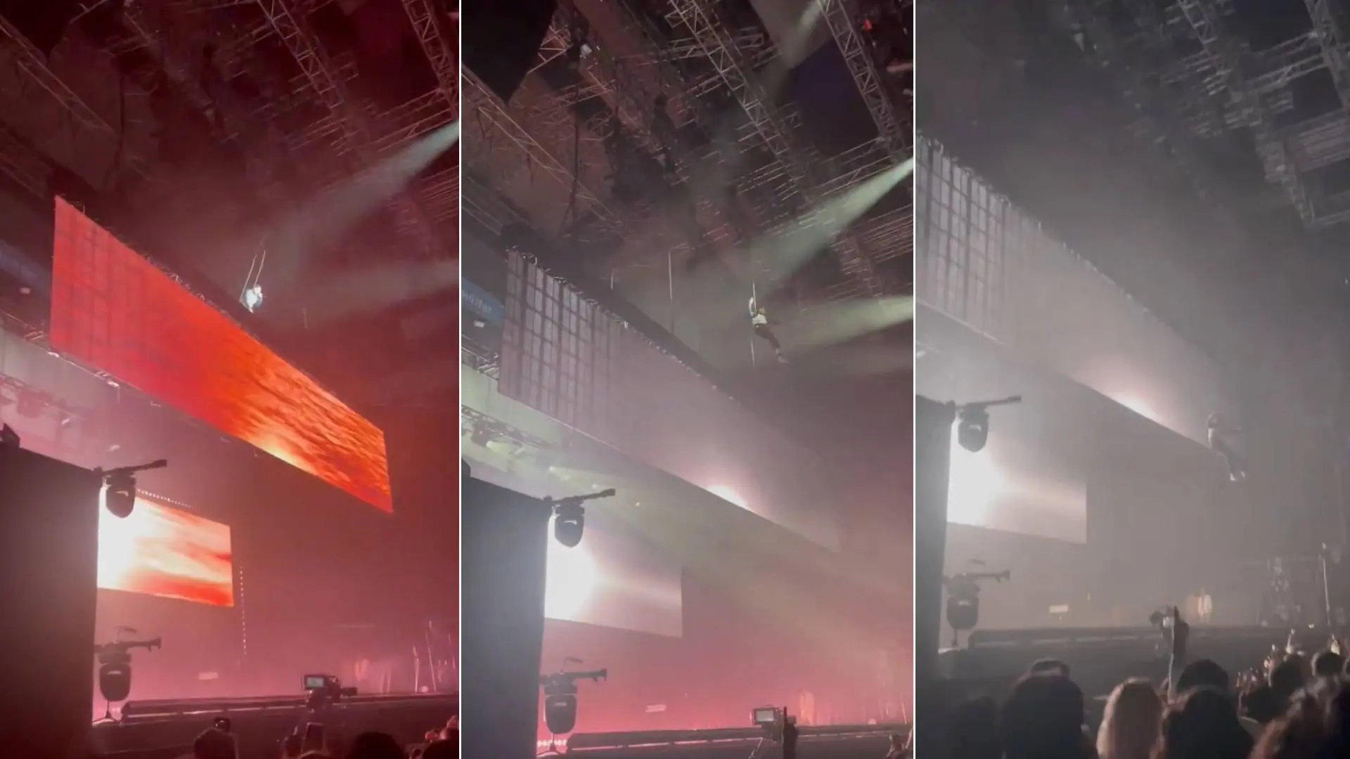 En redes sociales han sido varios los vídeos que sus seguidores han publicado sobre el accidente, cuyo origen parece estar en un fallo del sistema de arnés que le sujetaba mientras se lanzaba al vacío desde lo más alto del escenario.