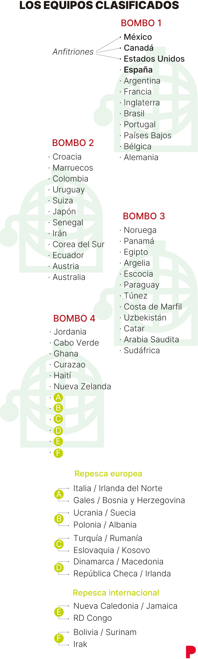 el bomba 4 todavía está por resolver, pero de momento están confirmadas selecciones menores como Jordania, Cabo Verde, Ghana, Curazao, Haití y Nueva Zelanda.