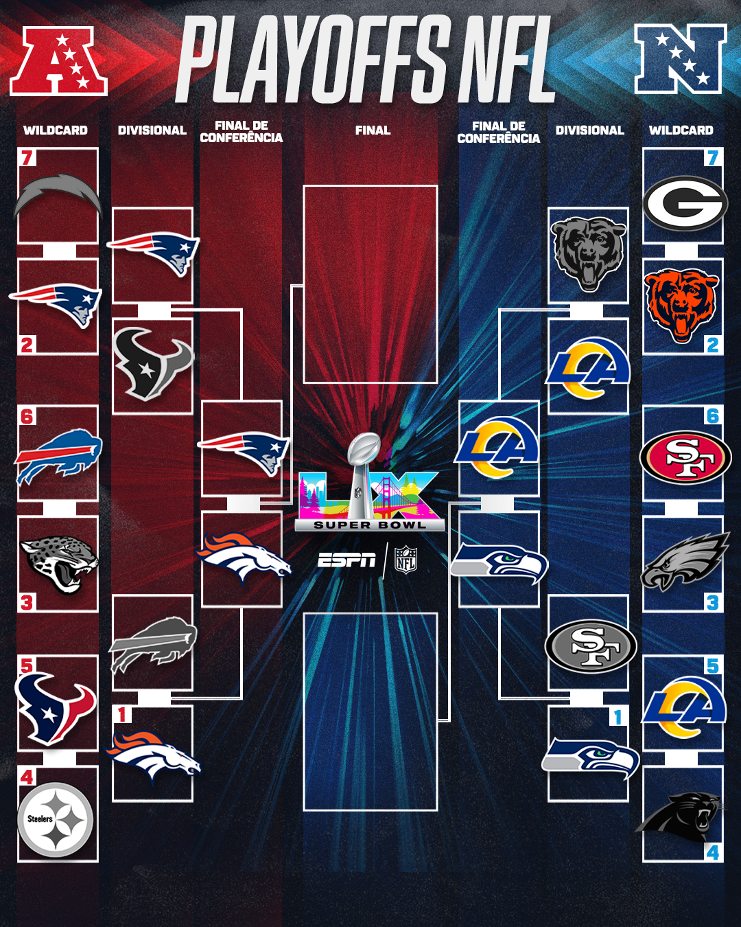 El próximo domingo (25), Broncos de Denver, Patriotas de Nueva Inglaterra, Halcones Marinos de Seattle mi Rams de Los Ángeles Medirão forças por um lugar no Olimpo do futebol americano.