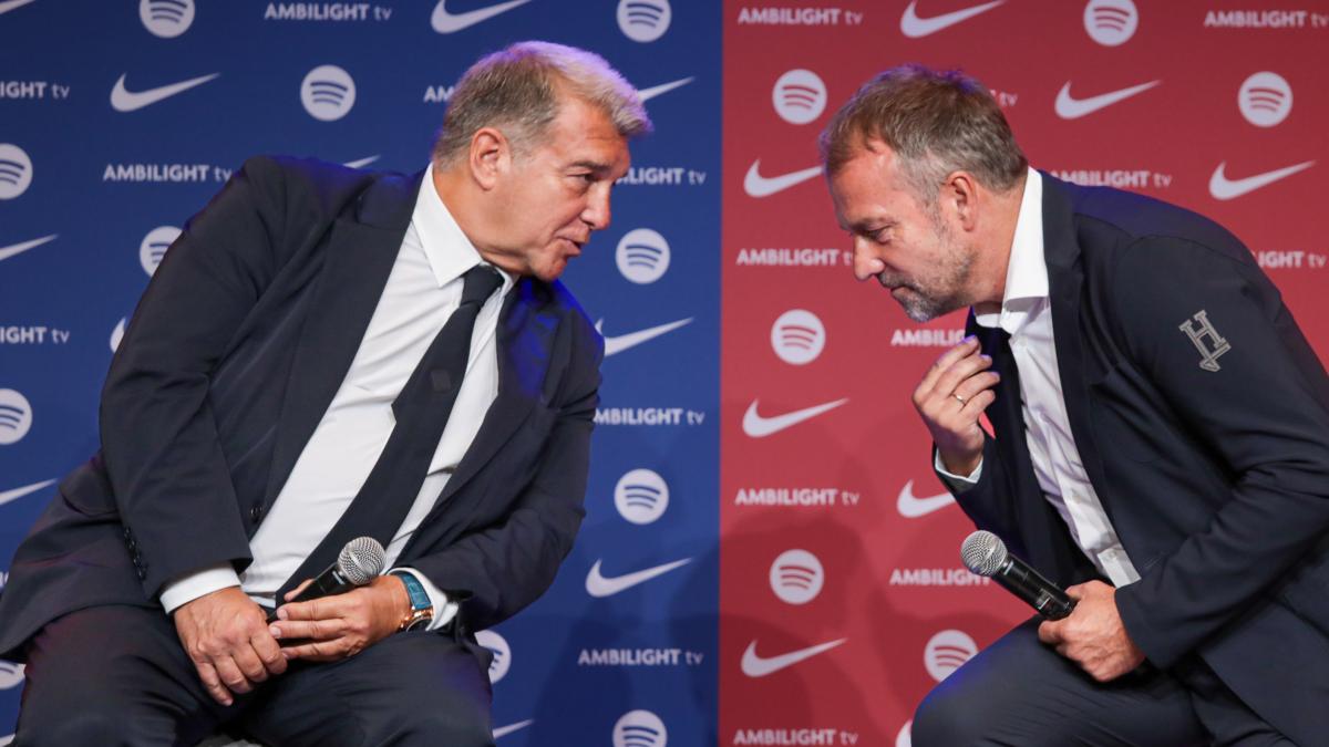 El presidente del FC Barcelona, Joan Laporta junto al entrenador Hansi Flick