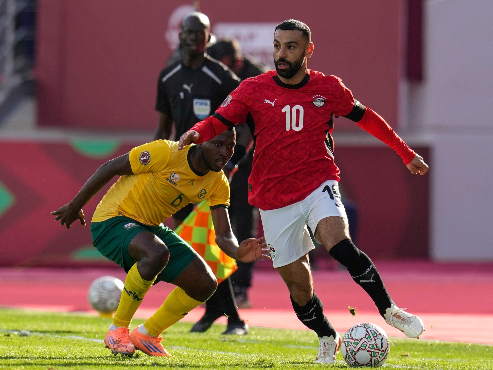 En ese ataque casi estelar fue Salah quien se destacó como nadie. En la primera mitad inventó el penal que abrió el marcador, decisivo en la tarde de Agadirla ciudad costera que ofició de sede, una de las seis que alberga el certamen. El zurdo tomó una pelota en el área, forcejeó con un rival tras perderla y recibió un leve manotazo en la cara que el VAR terminó sugiriendo con infracción penal. Más allá de la polémica y el enojo de los bafana bafanael 10 se hizo cargo y se convirtió sin problemas.