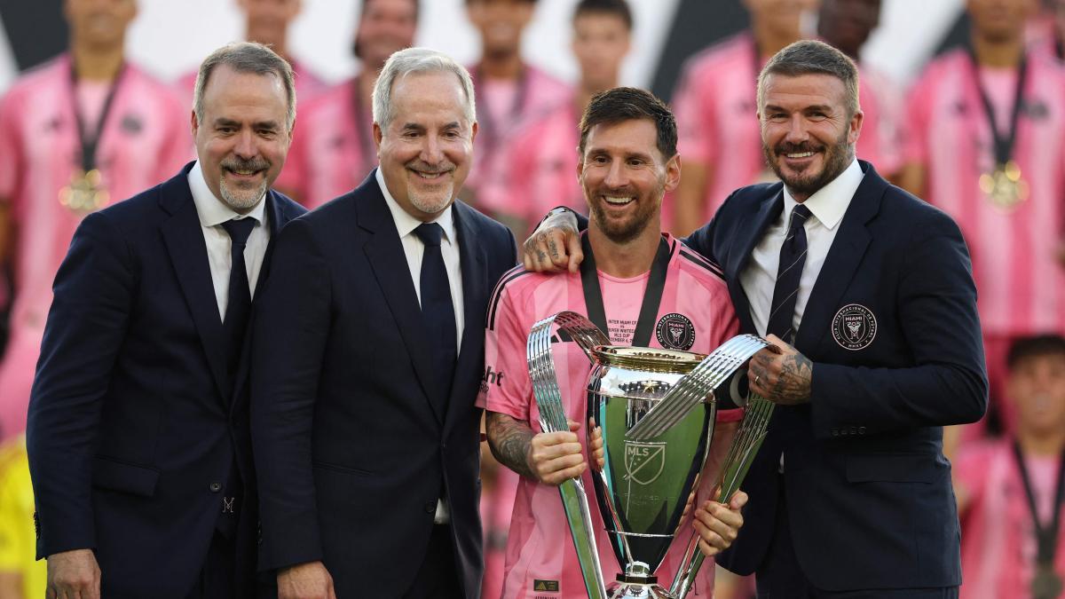 Los hermanos José y Jorge Mas y David Beckham, copropietarios del Inter Miami, flanquean a Messi con el trofeo de campeón