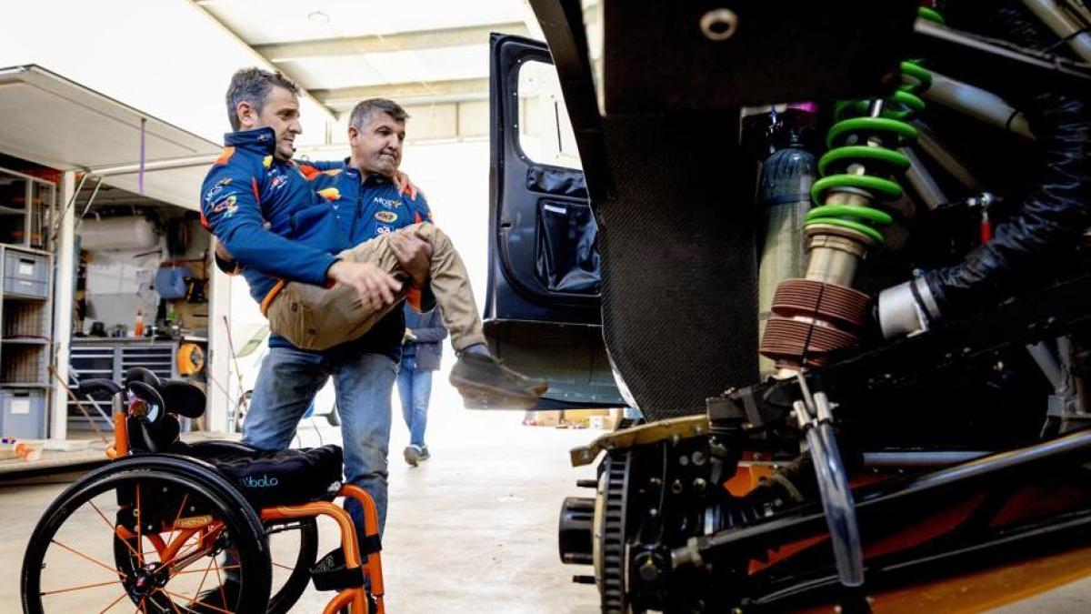 –¡No, basta ya de “ángel”…! Desde que es mi copiloto le llaman “el ángel de la guarda”… Estoy hasta la coronilla…! –ríe Isidre Esteve (53) mientras su inseparable Txema Villalobos se agacha, pone las manos bajo las piernas inmóviles del piloto de Oliana, y con un movimiento suave y delicado lo eleva hacia el habitáculo del Toyota Hilux a medio montar en una nave industrial de Cassà de la Selva (Girona), antes de que lo embarquen hacia Arabia Saudí.