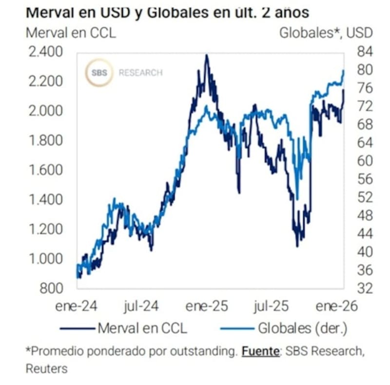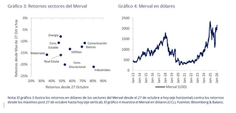 “En lo que va de 2026 el Merval en dólares acumula una caída de 4,5%, por debajo de los principales índices regionales, y en 2025 registró una baja en dólares, mientras que el resto de la región obtuvo retornos superiores. detallaron.