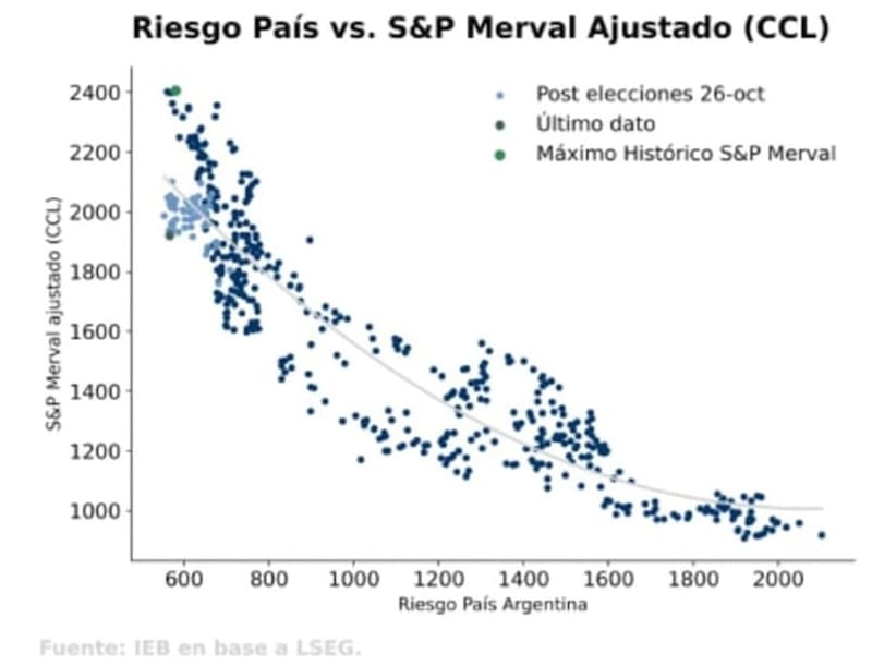 Los analistas de IEB detallaron que, la continua lateralización del S&P Merval en torno a los u$s 2000 y con un riesgo país que se mantiene constante, ha llevado a las acciones locales a mantenerse subvaluado con respecto a la deuda soberana luego del fuerte rally que experimentó el mercado argentino tras la victoria de LLA el 26 de octubre.