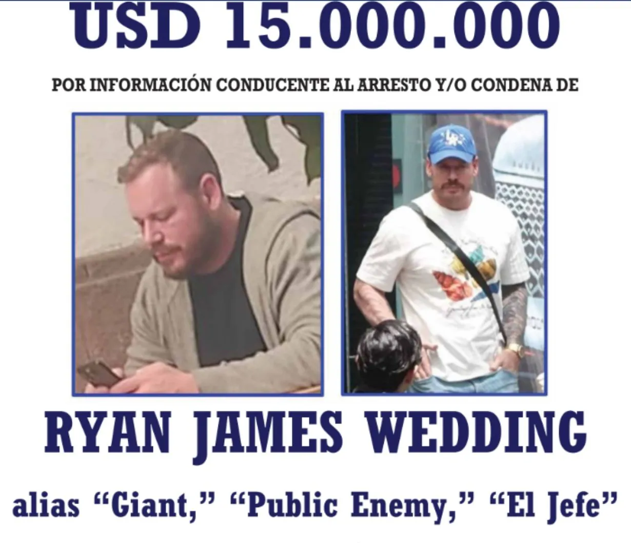 La embajada de Estados Unidos en México informó que el Buró Federal de Investigaciones de Estados Unidos (FBI)en coordinación con los gobiernos de Canadá y México, ofrece recompensa de hasta 15 millones de dólares por información que permita la captura del ciudadano canadiense y exatleta olímpico Ryan James Wedding.