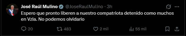 «Espero que pronto liberen a nuestro compatriota detenido como muchos en Vzla (sic). No podemos olvidarlo», escribió Mulino en X, un mensaje que coincide con el anuncio hoy desde Venezuela de la liberación inmediata de «un número importante de personas», que incluyen a venezolanos y extranjeros, presos en el país suramericano.