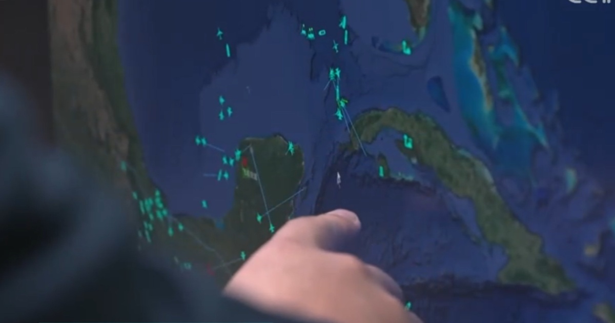 En otro momento del reportaje, un primer plano centrado en Cuba mostró líneas de trayectoria de aviones y barcos. “en la región”, lo que el texto interpreta como una probable simulación de una operación táctica, con investigadores chinos señalando la pantalla y discutiendo la situación.