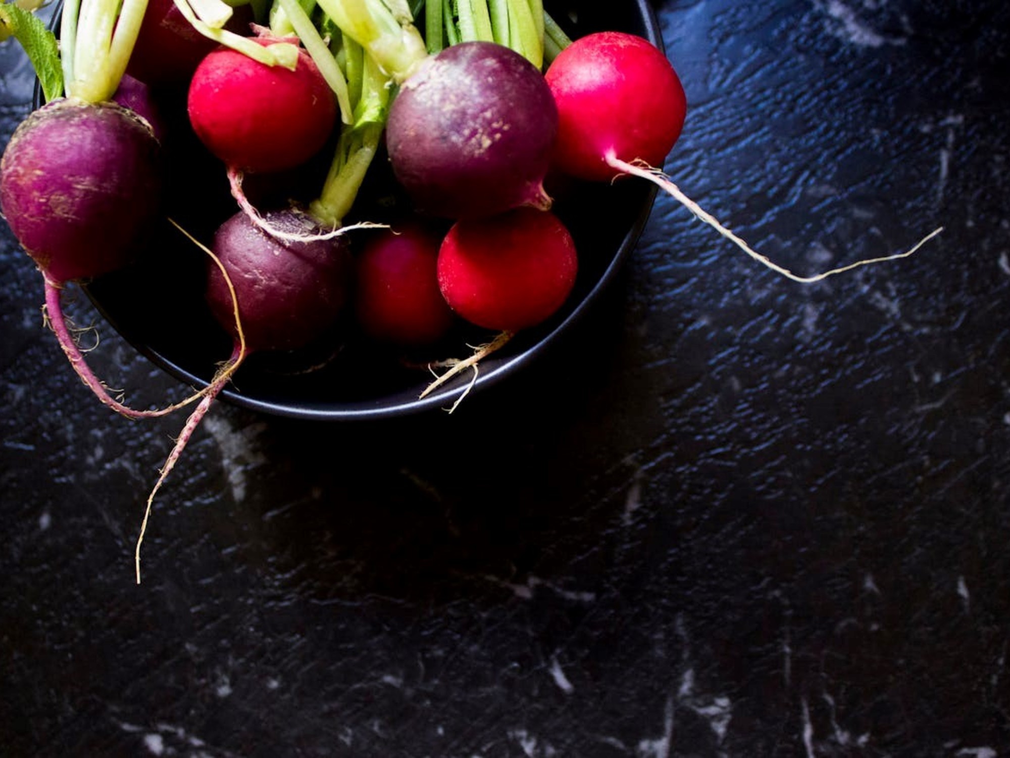 6. Preparación del rábano. Cortar en láminas muy finas. Si se desea, deje un rato en agua fría para suavizar su picor. Porta frescura y contraste.