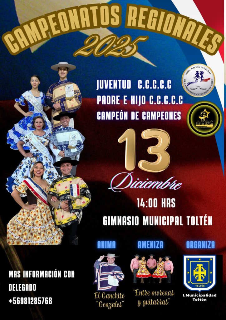 Con el objetivo de realizar un evento cultural que reúne a los amantes de la cueca, este sábado 13 de diciembre, desde las 14:00 horas, en el gimnasio municipal de Nueva Toltén, será sede del “Campeonato Regional de Cueca 2025”. Esta es una actividad que fomenta nuestro del folclore, la tradición y la identidad nacional. La entrada es liberada y se espera que una docena de parejas compitan en las diversas categorías.