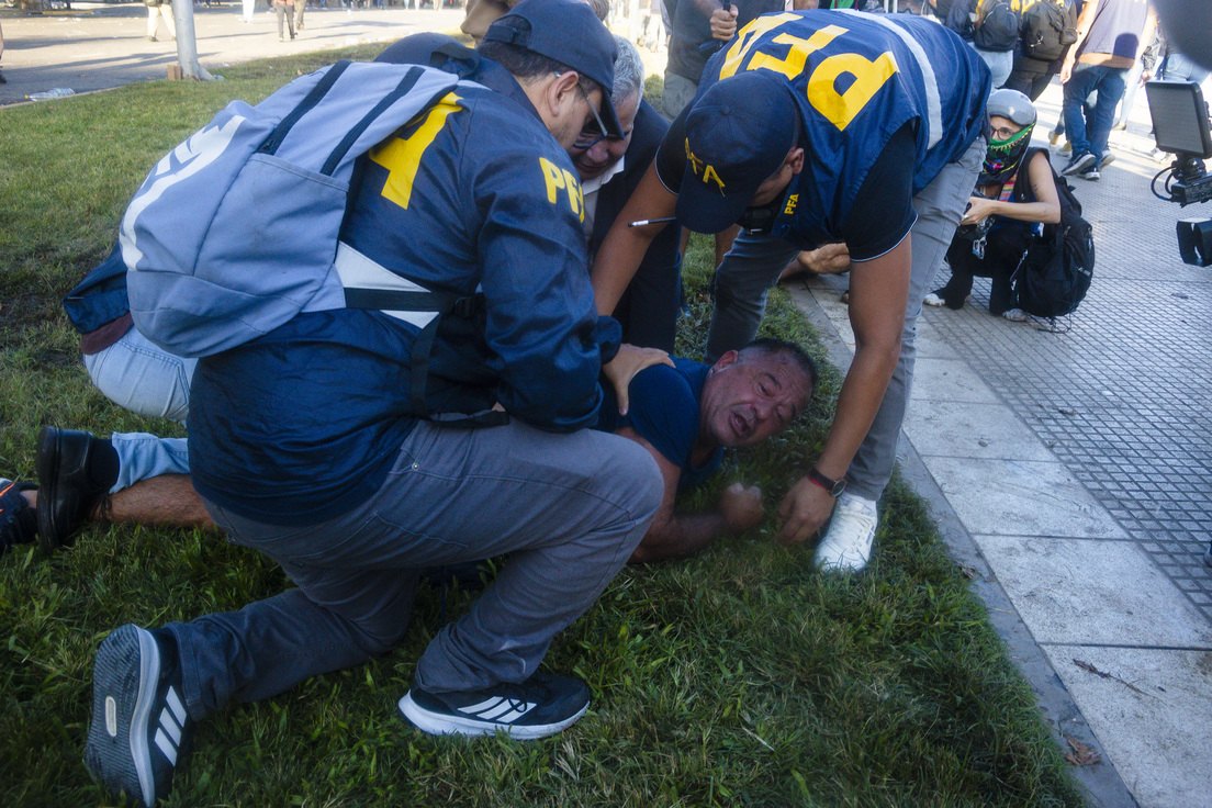 Tras el corte de las avenidas 9 de Julio y Corrientes los efectivos de seguridad embistieron contra los manifestantes pacíficos utilizando gas pimienta y balas de gomasegún reportan medios locales.