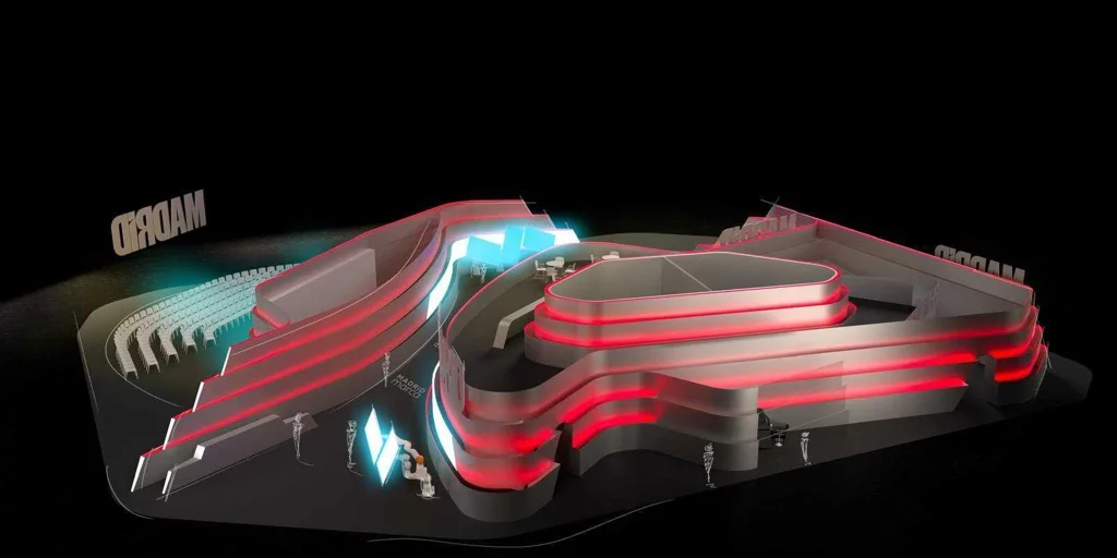 El espacio, construido en acero y con una curva estética y acabado metálico, reproduce en su planta el trazado del circuito Madring y evoca los carriles por los que circularán los monoplazas. El diseño transmite la tecnología y modernidad asociadas a esta disciplina deportiva en el marco del Año del Turismo Deportivo a la vez que remite también a las líneas arquitectónicas de dos grandes iconos deportivos de la capital, el Santiago Bernabéu y el Riyadh Air Metropolitano.