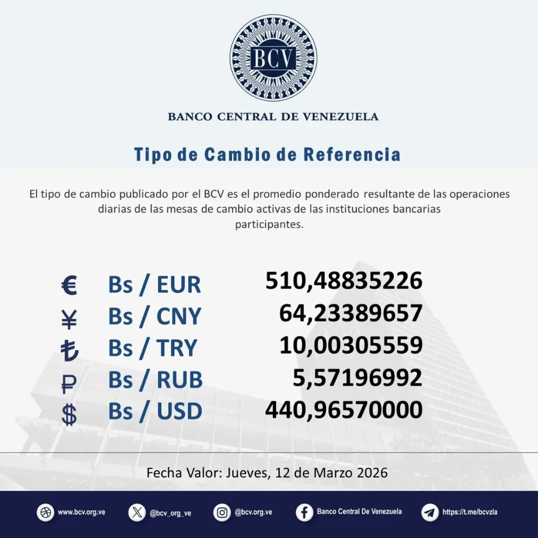 El Banco Central de Venezuela (BCV) anunció este miércoles un nuevo ajuste en el tipo de cambio oficial, vigente hasta el jueves 12 de marzo.