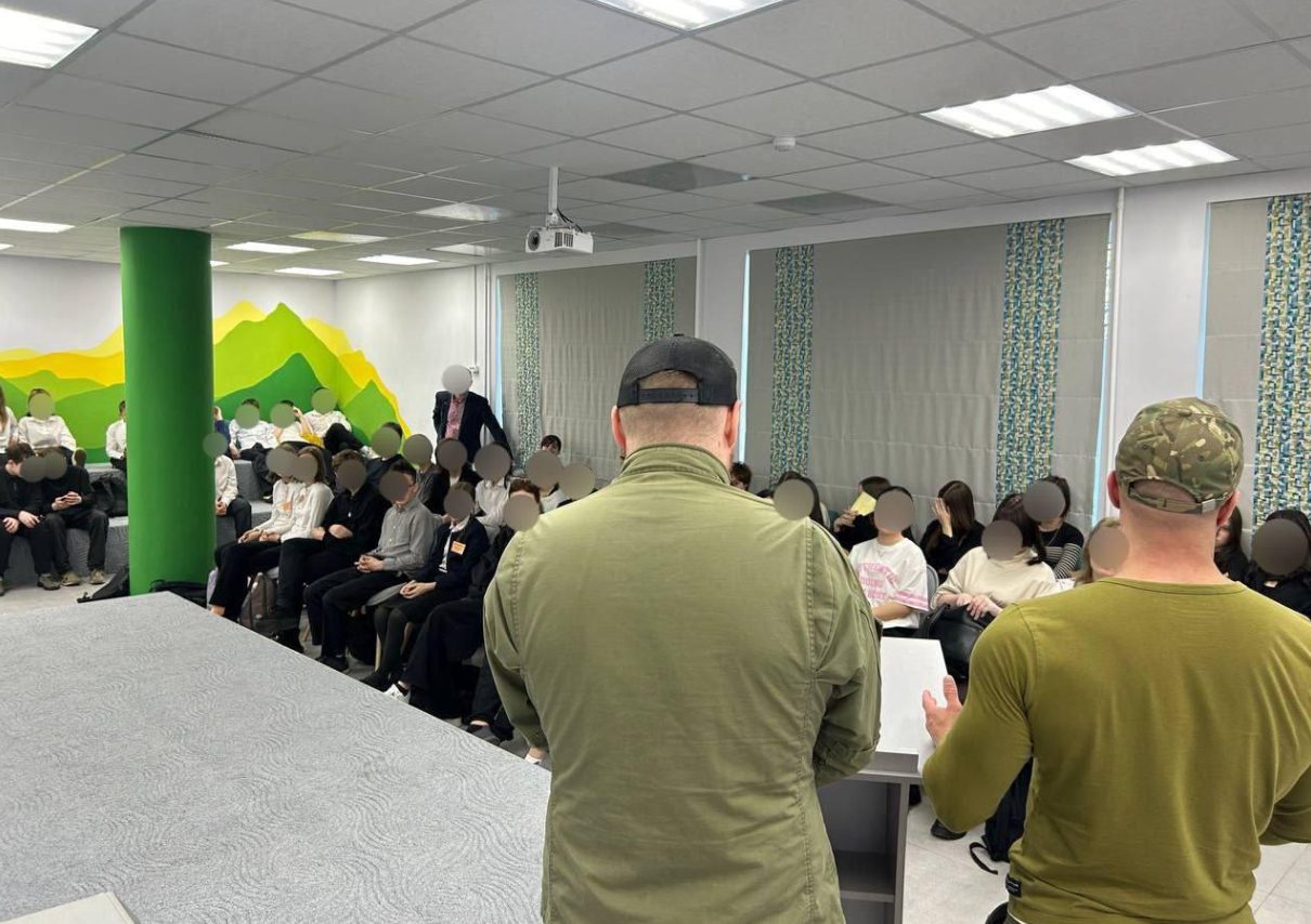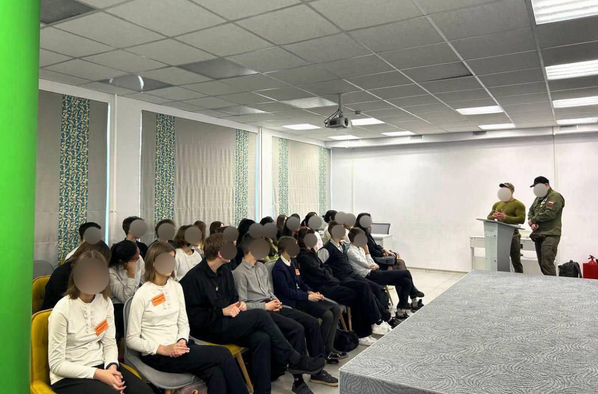 El famoso neonazi Alexei Milchakov, fundador de la Rusich, llegó a una escuela para dar a los niños una «lección de coraje» en San Petersburgo, Rusia.