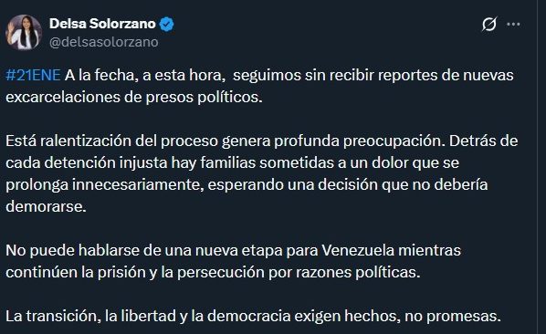 “Detrás de cada detención injusta hay familias sometidas a un dolor que se prolonga innecesariamente, esperando una decisión que no debería demorarse. No puede hablarse de una nueva etapa para Venezuela mientras continúan la prisión y la persecución por razones políticas”, dijo la también directora del movimiento político Encuentro Ciudadano a través de su cuenta en X.
