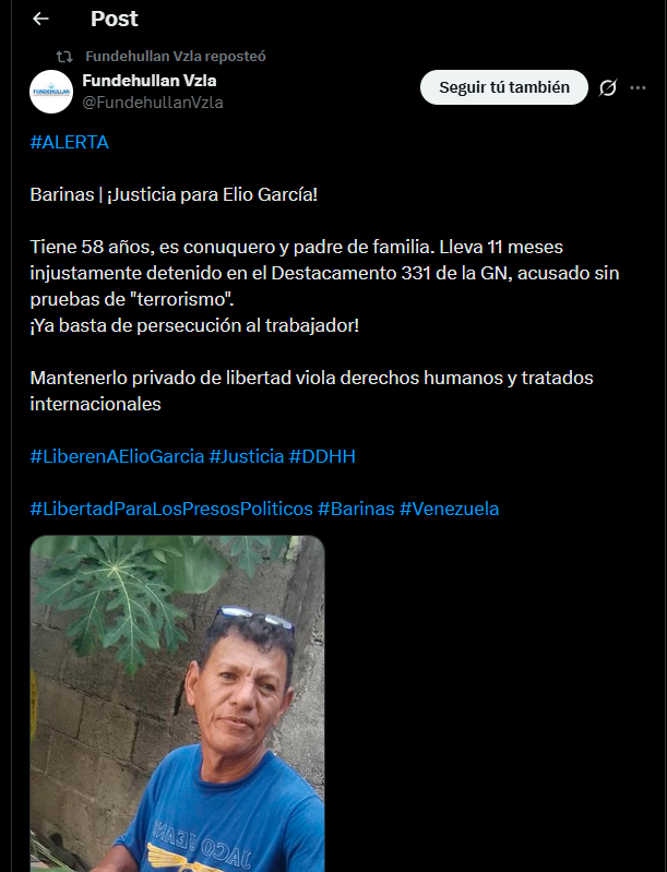 La Fundación de Derechos Humanos Los Llanos (Fundehullan) lanzó este sábado 7 de marzo, una alerta en su cuenta oficial de incógnita sobre la situación de Elio García, un conuquero y padre de familia de 58 años, quien permanece injustamente detenido desde hace 11 meses en el Destacamento 331 de la Guardia Nacional (GN), acusado sin pruebas de “terrorismo”.