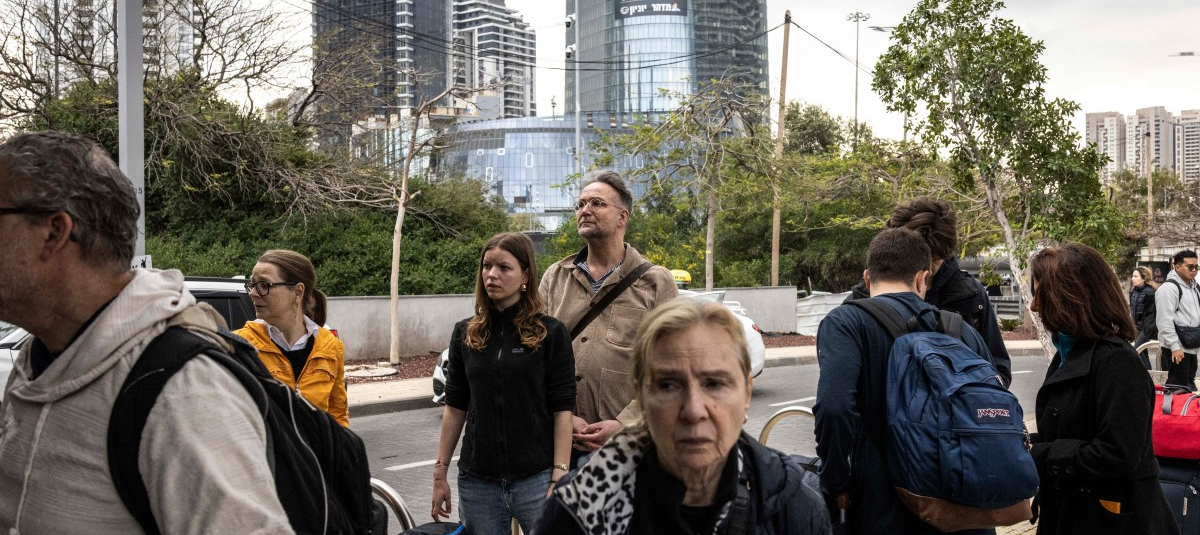 Los turistas esperan para subir a los autobuses que los evacuarán al paso fronterizo de Taba con Egipto en Tel Aviv. Foto: AFP