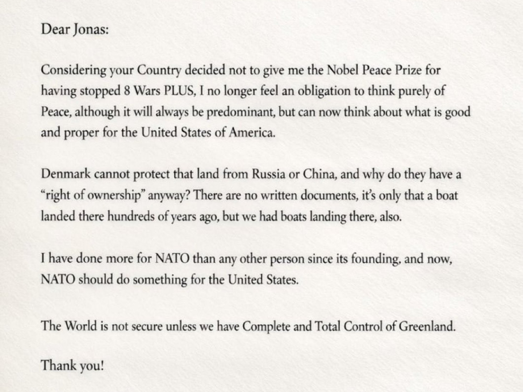 Estimado Jonas: Considerando que su país decidió no otorgarme el Premio Nobel de la Paz por haber detenido 8 guerras MÁS, ya no siento la obligación de pensar únicamente en la paz, aunque siempre será predominante, sino que ahora puedo pensar en lo que es bueno y apropiado para los Estados Unidos de América.