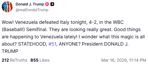 El presidente de Estados Unidos, Donald Trump, planteó la incorporación de Venezuela como el estado número 51 de su país luego del triunfo de la selección nacional sobre Italia en la semifinal del Clásico Mundial de Béisbol. El mandatario publicó un mensaje en su plataforma Truth Social el lunes 16 de marzo para reaccionar al resultado del encuentro deportivo.