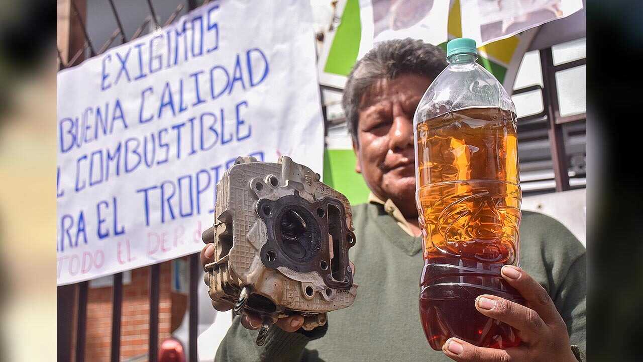 Exponiendo botellas con gasolina de tono oscuro y autopartes de vehículos dañados, los conductores del Transporte Libre tomaron ayer las instalaciones de la Agencia Nacional de Hidrocarburos (ANH) de Cochabamba y bloquearon las vías colindantes en el centro de la ciudad, en rechazo al presunto “mal estado del combustible” que reciben en los surtidores.