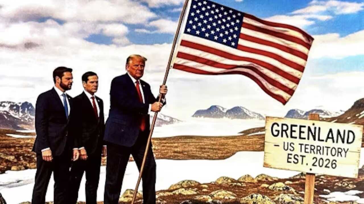 Según se ve en la imagen generada con inteligencia artificial, Trump aparece acompañado por el vicepresidente estadounidense, JD Vance, y el secretario de Estado, Marco Rubio, con un cartel cerca que dice “Groenlandia-Territorio de los Estados Unidos Est. 2026”.