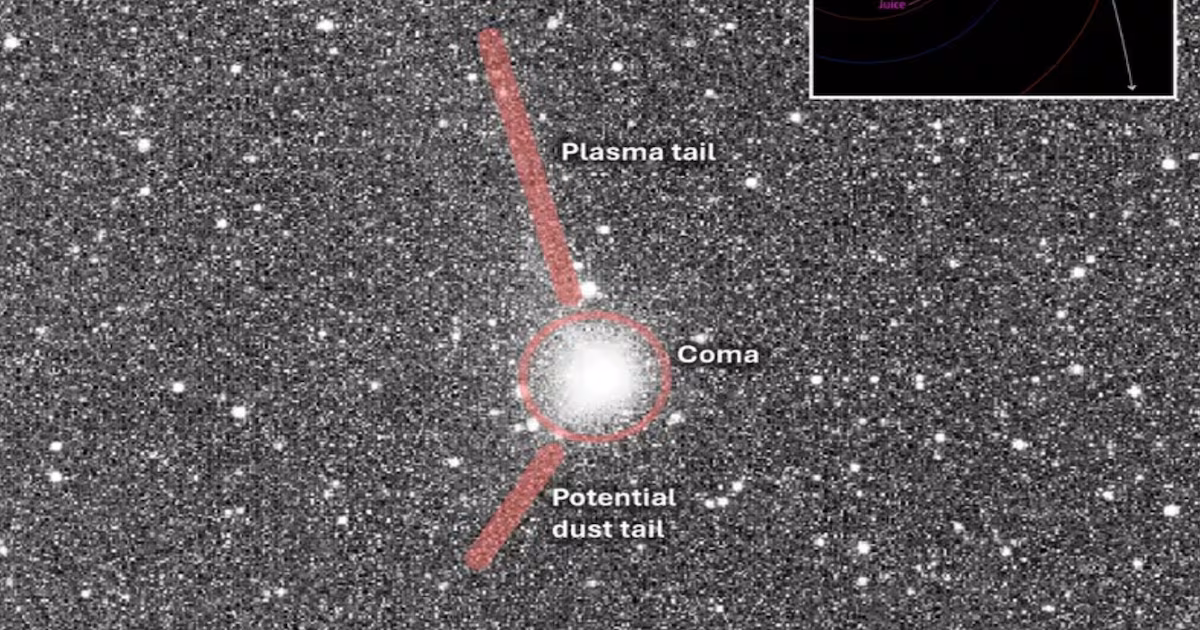 - Doble Cola Confirmada: Más significativa aún, la imagen revela indicios de dos colas: una cola de plasma (compuesta por gas ionizado) y una cola de polvo (formada por partículas sólidas). La presencia inmediata de ambas colas valida que la sonda JUICE capturó al objeto en un momento de máxima desgasificación, justo después de su paso por el perihelio (el punto más cercano al Sol).