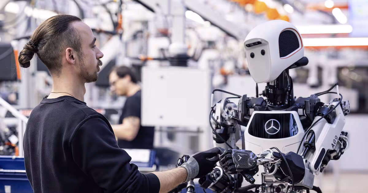 Los robots humanoides avanzan en la industria automotriz. Mercedes-Benz prueba la combinación de robots humanoides Apollo von Apptronik en la producción. Mercedes-Benz está probando en producción el uso del robot humanoide Apollo, de Apptronik. (Mercedes-Benz AG – Comunicati/Mercedes-Benz AG)